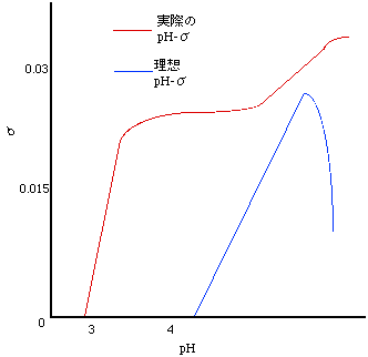 ■第四章 考 察 実際のpH-σ曲線と理想pH-σ曲線との関係をFig-6に示す。 Fig-6 実際のpH-σ曲線と理想pH-σ曲線との関係 実際の曲線と理想の曲線との差はブランクに問題があるのではないかと考えられる。ブランク実験に何らかの問題があったと考えられる。 [参考文献] 後藤兼平 物理化学実験法 共立出版(1965) 多田旭男ら 新しい物理化学実験 三共出版(1993)