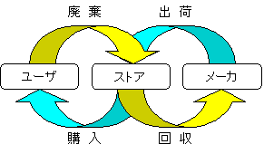 そこで、工業製品の循環システムを図のように提案する。メーカによって作られた物質はストアに出荷され、ユーザに購入される。不要となった段階で廃棄される物質をユーザはストアに運ぶ。持ち込まれた物質はストアからメーカに回収される。これを物質の回帰システムという。
